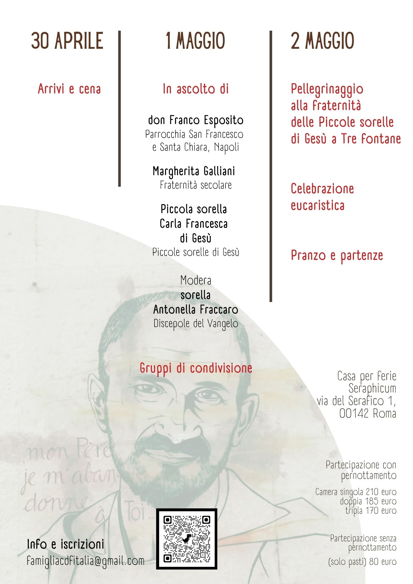 Il 2 maggio ci metteremo in cammino verso la Fraternità delle Piccole sorelle di Gesù a Tre fontane. Vivremo un momento di scambio e di condivisione con le sorelle, celebreremo l’Eucarestia e fraternamente consumeremo il pranzo. Sarà un modo per conoscere più da vicino una delle fraternità che compongono la famiglia spirituale.