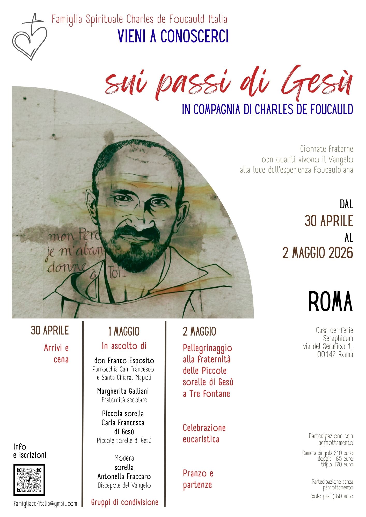 Il 2 maggio ci metteremo in cammino verso la Fraternità delle Piccole sorelle di Gesù a Tre fontane. Vivremo un momento di scambio e di condivisione con le sorelle, celebreremo l’Eucarestia e fraternamente consumeremo il pranzo. Sarà un modo per conoscere più da vicino una delle fraternità che compongono la famiglia spirituale.